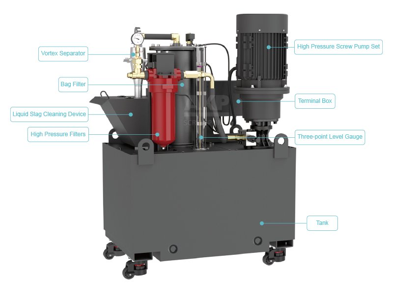 A3SS-XT10 Liquid Slag Collection High Pressure Coolant System, on the basis of XT2 configuration of different filtration combinations, liguid slag manual cleaning device can effectively prevent the secondary pollution of the debris discharge tank, the filter combination method of scroll separation and cloth bag is suitable for fine chips of aluminum,stainless steel and carbon steel, and is not suitable for powdery chips.